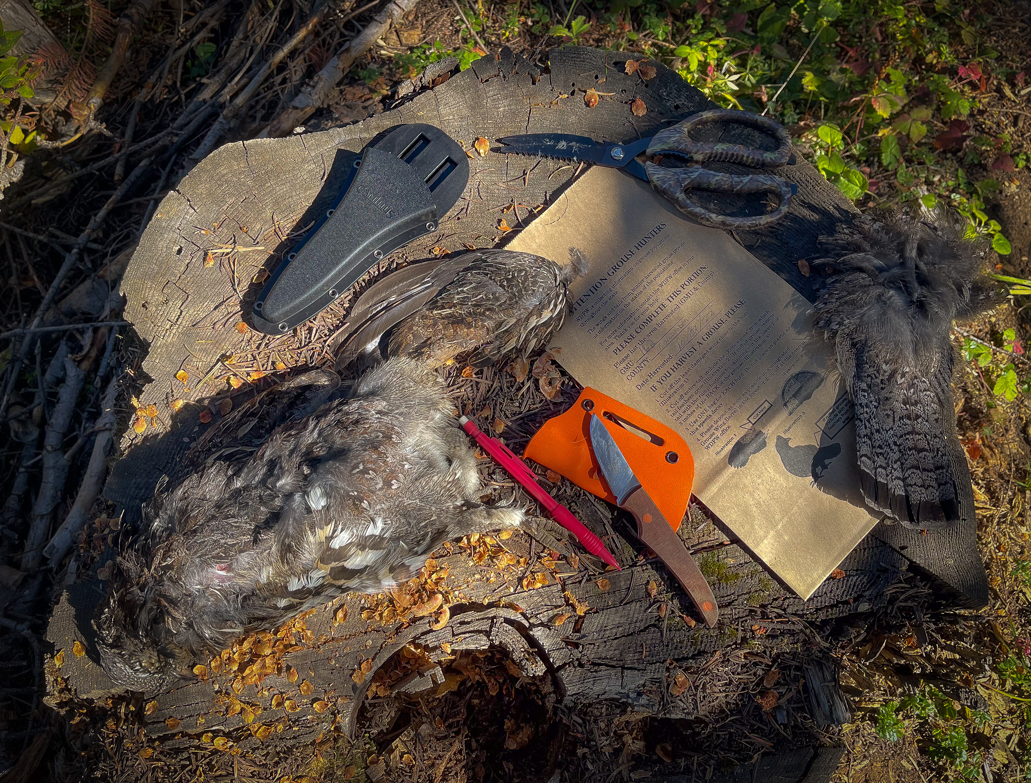 WDFW would like to remind us grouse hunters of the wing and tail collection barrels placed at various areas in the Blue Mountains. Forest grouse wings and tails contributed by upland hunters are analyzed each winter by WDFW biologists to estimate harvest, age, and sex of the grouse being taken.